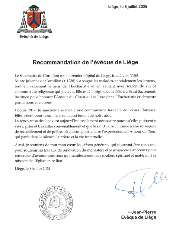 L’évêque de Liège soutient le développement du Sanctuaire de sainte Julienne et du monastère des Clarisses qui occupent le monastère depuis 2017. Elles prient pour nous, mais ont aussi besoin de notre aide. La rénovation des lieux est aujourd’hui réellement nécessaire pour qu’elles puissent y vivre, prier et travailler convenablement et que le sanctuaire c::mtinue à être un espace de recueillement et de prière, où chacun pourra faire l’expérience de l’Amour de Dieu, qui parle dans le silence, la prière et la vie fraternelle.